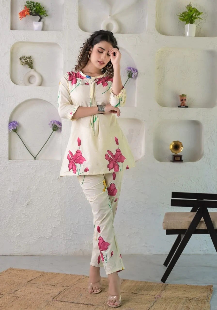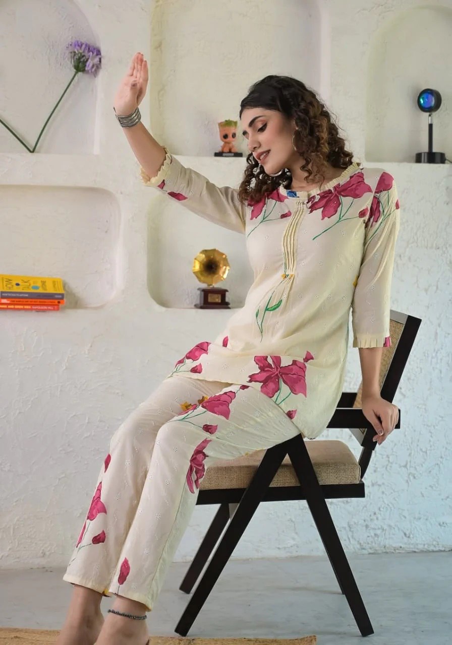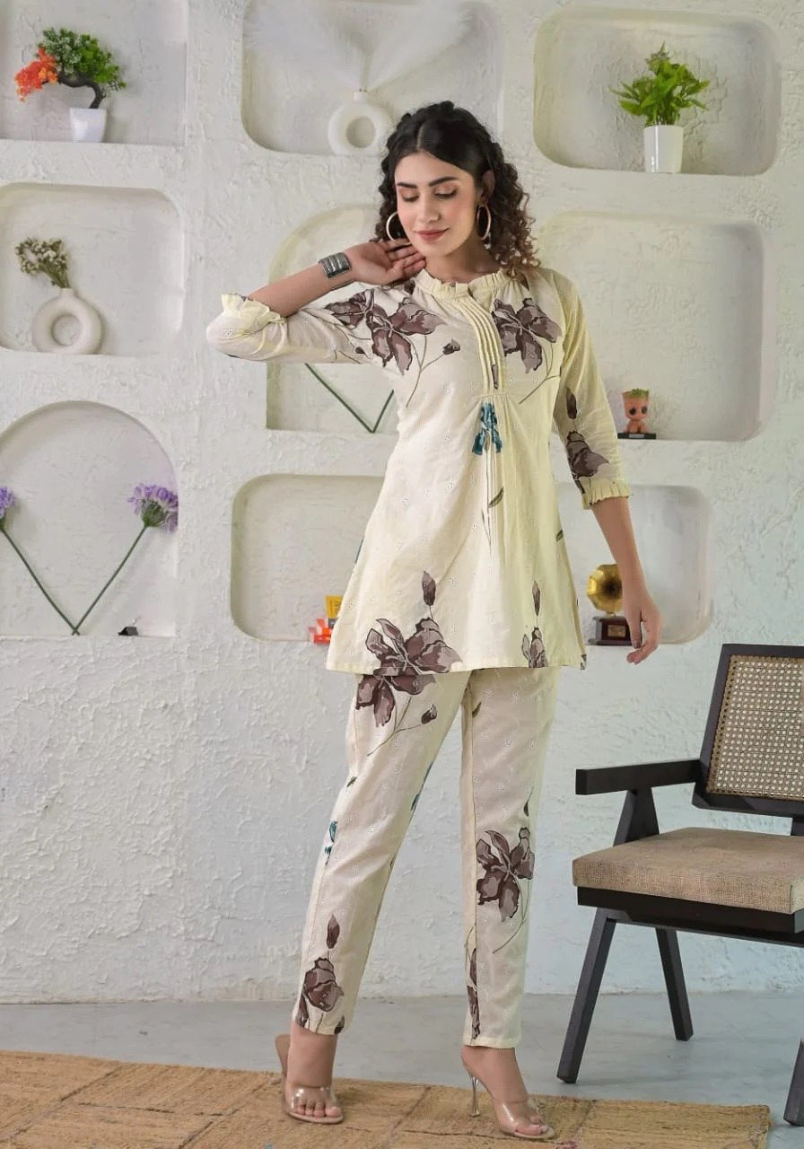Prepare to get overwhelmed with a swirl of compliments by dressing yourself in this Ivory floral schiffli coordinate set. It is also perfect for office, brunch outings, cards night and airport look.