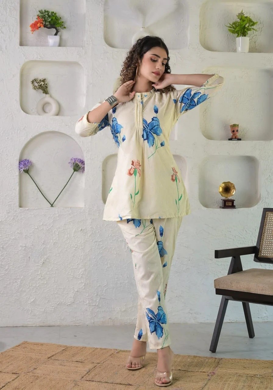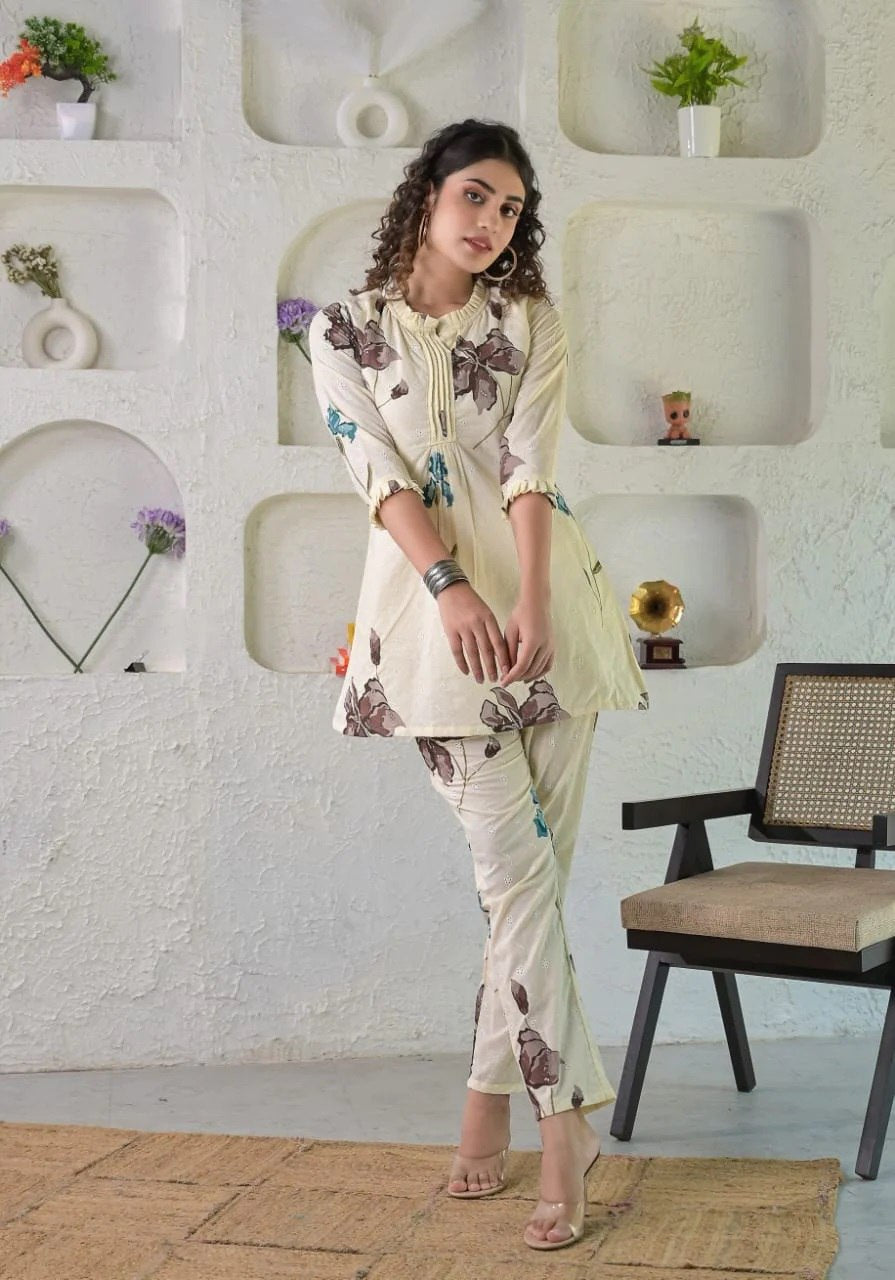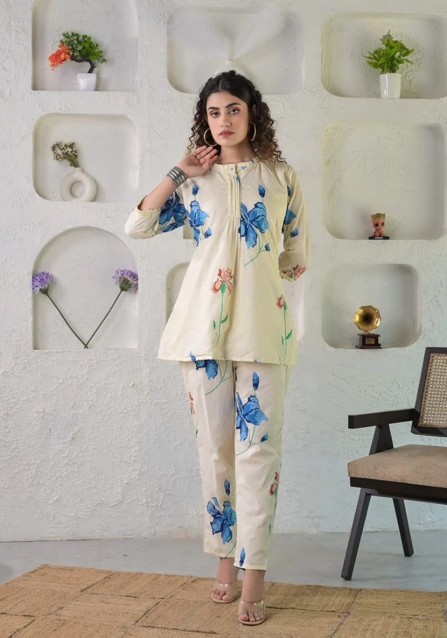 Prepare to get overwhelmed with a swirl of compliments by dressing yourself in this Ivory floral schiffli coordinate set. It is also perfect for office, brunch outings, cards night and airport look.